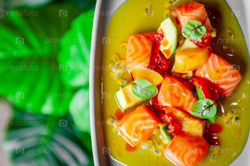 Севиче из лосося с сальсой из авокадо, апельсина и манго