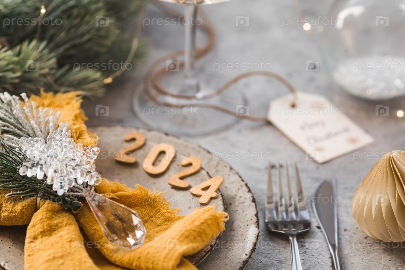 Сервировка стола. Стильные тарелки, салфетка, бокал, шампанское, елочные ветки и рождественские украшения на сером фоне. Концепция счастливого Рождества и Нового 2024 года