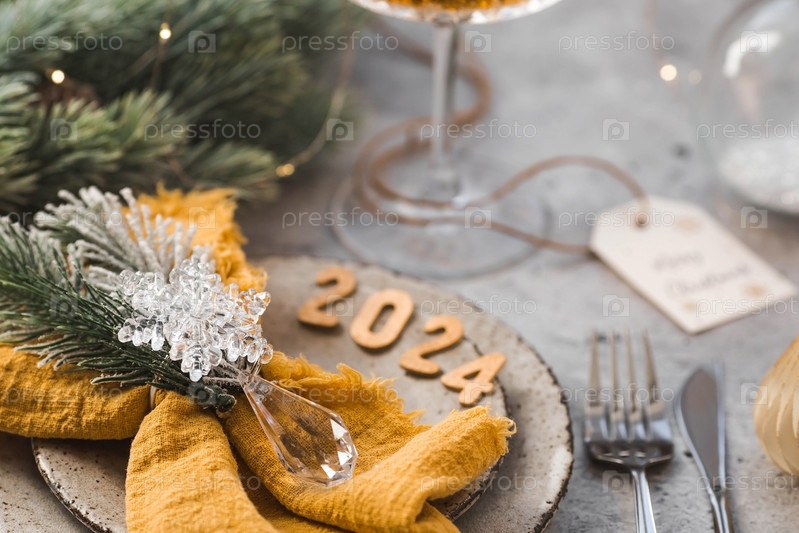 Сервировка стола. Стильные тарелки, салфетка, бокал, шампанское, елочные ветки и рождественские украшения на сером фоне. Концепция счастливого Рождества и Нового 2024 года