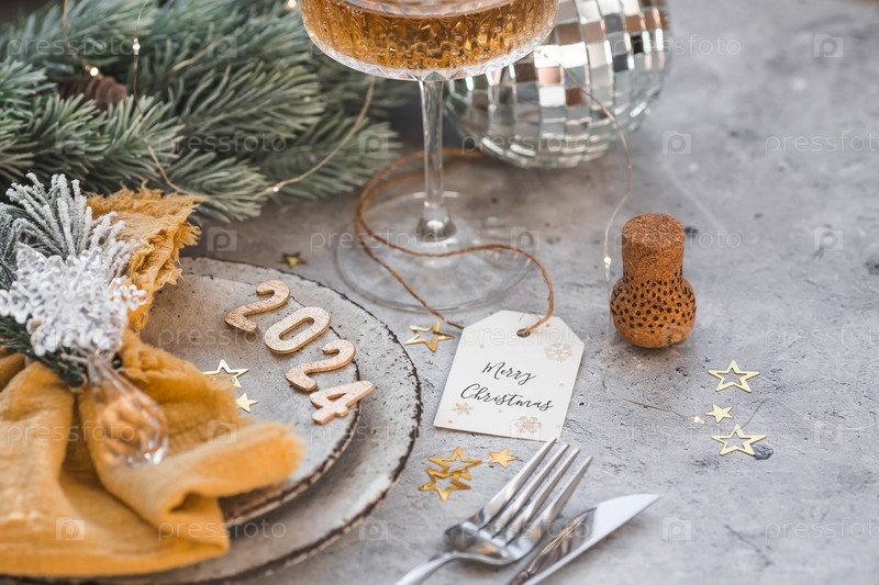 Сервировка стола. Стильные тарелки, салфетка, бокал, шампанское, елочные ветки и рождественские украшения на сером фоне. Концепция счастливого Рождества и Нового 2024 года
