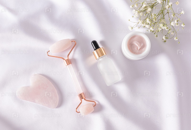 Роликовый массажер из розового кварца, скребок гуаша, масло для массажа и ухода в матовом флаконе и баночке крема на белом атласе. Вид сверху. Лифтинговый эффект