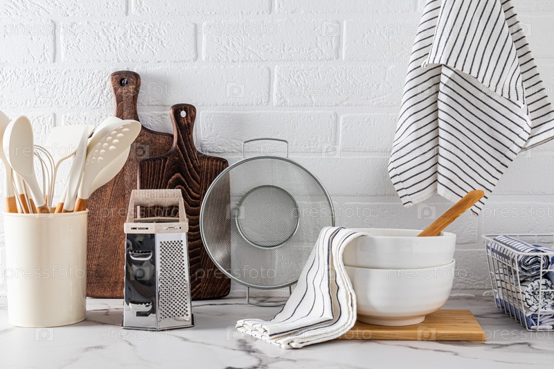 Множество различной кухонной утвари из дерева, керамики, металла на столешнице из светлого камня. Экологически чистые материалы. Передний план