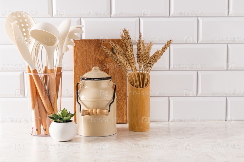 Современные кухонные инструменты и кухонная утварь на кухонной столешнице. Передний план. Копия помещения. Светлые цвета. Эко товары