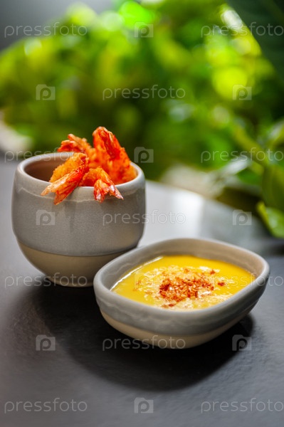 Жареные во фритюре креветки в темпуре с пряным соусом на тарелке на темном фоне