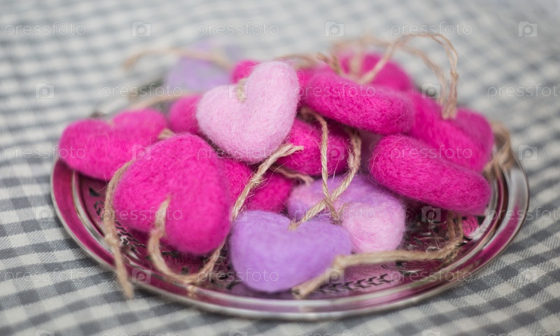 Маленькие шерстяные сердечки на серебряном блюде