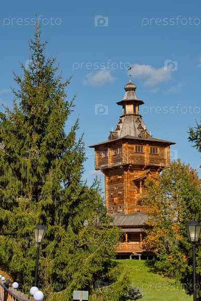 Московская область. Россия. Сентябрь 27, 2023. Уникальная архитектура православного деревянного комплекса у святого источника Гремячий Ключ