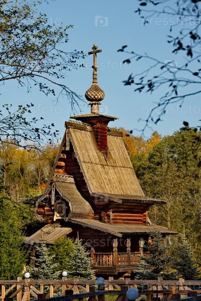Московская область. Россия. Сентябрь 27, 2023. Уникальная архитектура православного деревянного комплекса у святого источника Гремячий Ключ