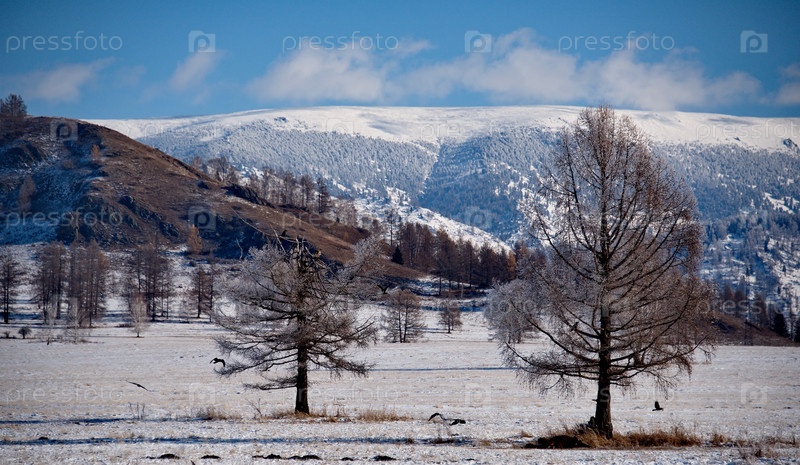 Россия. Юг Западной Сибири, Горный Алтай. Горные степи покрытые первым снегом вдоль Чуйского тракта