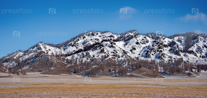 Россия. Юг Западной Сибири, Горный Алтай. Горные степи покрытые первым снегом вдоль Чуйского тракта