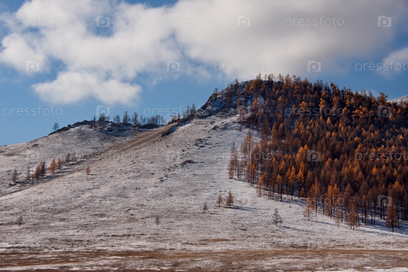 Россия. Юг Западной Сибири, Горный Алтай. Горные степи покрытые первым снегом вдоль Чуйского тракта