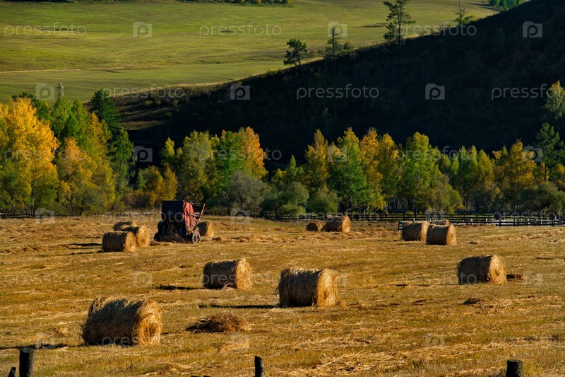 Россия. Юг Западной Сибири, Горный Алтай. Скошенные поля с тюками сена в долине реки Урал близ села Онгудай