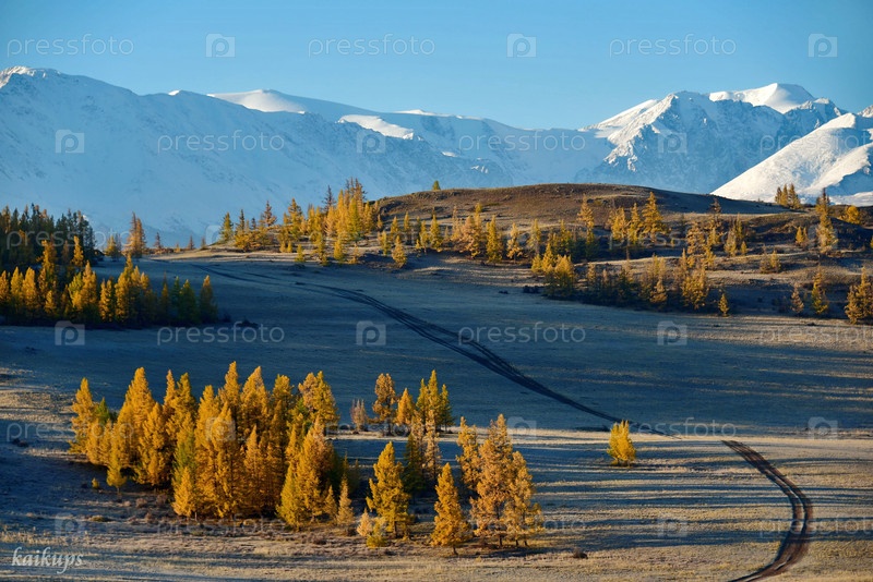Россия. Юг Западной Сибири, Горный Алтай. Горные степи покрытые первым снегом вдоль Чуйского тракта