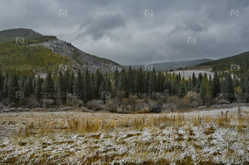 Россия. Юг Западной Сибири, Горный Алтай. Горные степи покрытые первым снегом вдоль Чуйского тракта