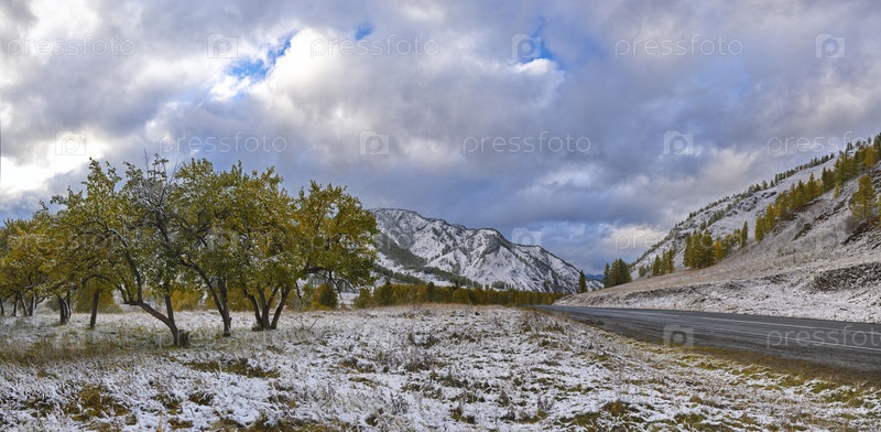 Россия. Юг Западной Сибири, Горный Алтай. Горные степи покрытые первым снегом вдоль Чуйского тракта