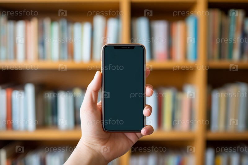 Мужская рука держит телефон на фоне книжных полок при естественном освещении