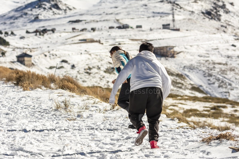 Латинская мать и сын бегут по снегу в Сьерра-Неваде, Гранада, Андалусия, Испания