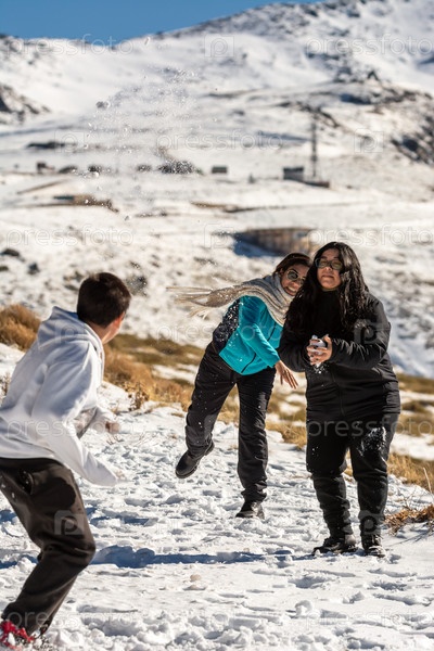 Латиноамериканцы, семья в заснеженных горах Сьерра-Невады в Гранаде, играют со снегом в солнечный день, Андалусия, Испания