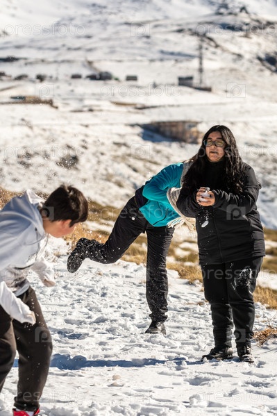Латиноамериканцы, бросающие снежки на горнолыжном курорте в Гранаде, Сьерра-Невада, Андалусия, Испания