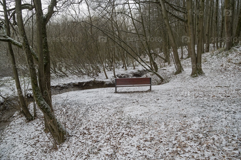 Скамейка на берегу ручья. Поздняя осень в московском лесопарке. Узкое, середина ноября, пасмурно