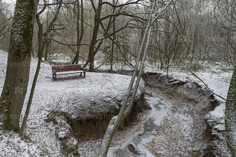 Скамейка на берегу ручья. Поздняя осень в московском лесопарке. Узкое, середина ноября, пасмурно