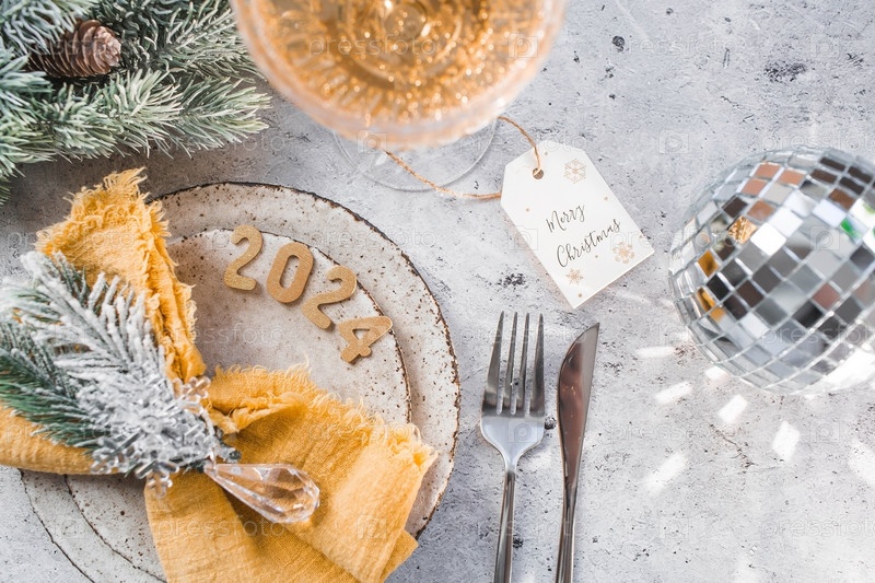 Сервировка стола. Стильные тарелки, салфетка, бокал, шампанское, елочные ветки и рождественские украшения на сером фоне. Концепция счастливого Рождества и Нового 2024 года