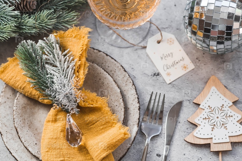 Сервировка стола. Стильные тарелки, салфетка, бокал, шампанское, елочные ветки и рождественские украшения на сером фоне. Концепция счастливого Рождества и Нового 2024 года