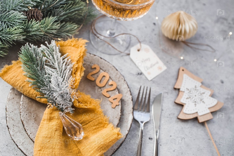Сервировка стола. Стильные тарелки, салфетка, бокал, шампанское, елочные ветки и рождественские украшения на сером фоне. Концепция счастливого Рождества и Нового 2024 года