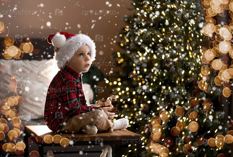 Красивый маленький мальчик в шапке Санта-Клауса сидит на столе на фоне рождественской елки и красивого боке. Концепция празднования Рождества и Нового 2024 года