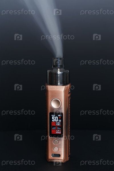 Современное электронное устройство с дисплеем и кнопками для парения. Макрофотография на темном фоне