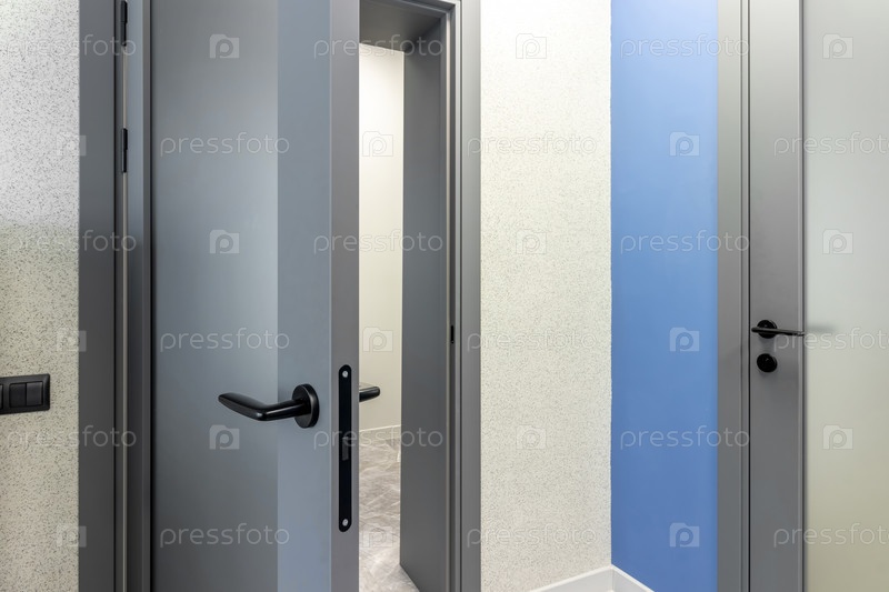 Серая дверь со стеклянной вставкой в офисном здании