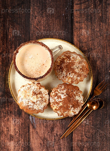 Шоколадные кексы с мускатным орехом и эгг-ногом с корицей на деревянном фоне, уютная концепция завтрака, реклама кафе или пекарни. Согревающий яичный напиток в холодное время года с вкусным десертом