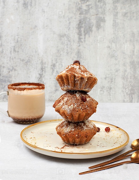 Шоколадные кексы с мускатным орехом и эгг-ногом с корицей на бетонном фоне, уютная концепция завтрака, реклама кафе или пекарни. Согревающий яичный напиток в холодное время года с вкусным десертом