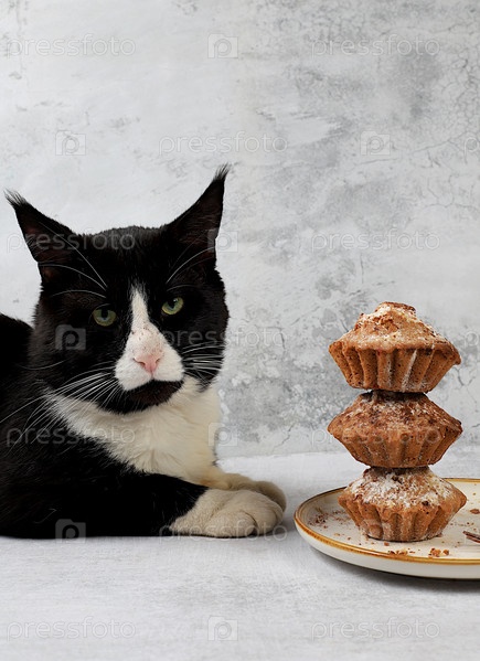 Большой лесной кот Мейн-кун на столе с шоколадными кексами, уютная концепция завтрака, избирательный фокус