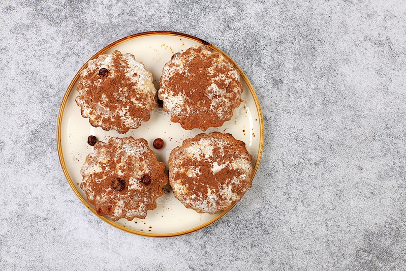 Шоколадные кексы с мускатным орехом и корицей на деревянном фоне, уютная концепция завтрака, реклама кафе или пекарни, вкусный десерт