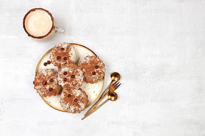 Шоколадные кексы с мускатным орехом и эгг-ногом с корицей на бетонном фоне, уютная концепция завтрака, реклама кафе или пекарни. Согревающий яичный напиток в холодное время года с вкусным десертом