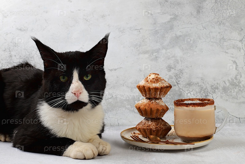 Большой лесной кот Мейн-кун на столе с эгг-ногом с корицей и шоколадными кексами, уютная концепция завтрака. Согревающий яичный напиток в холодное время года с вкусным десертом