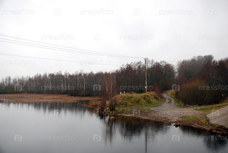 Осенний пейзаж на озере. Осенний день. Ровная водная поверхность без волн. По берегам озера растут кусты и деревья с желтой и коричневой листвой. Сверху серое облачное небо