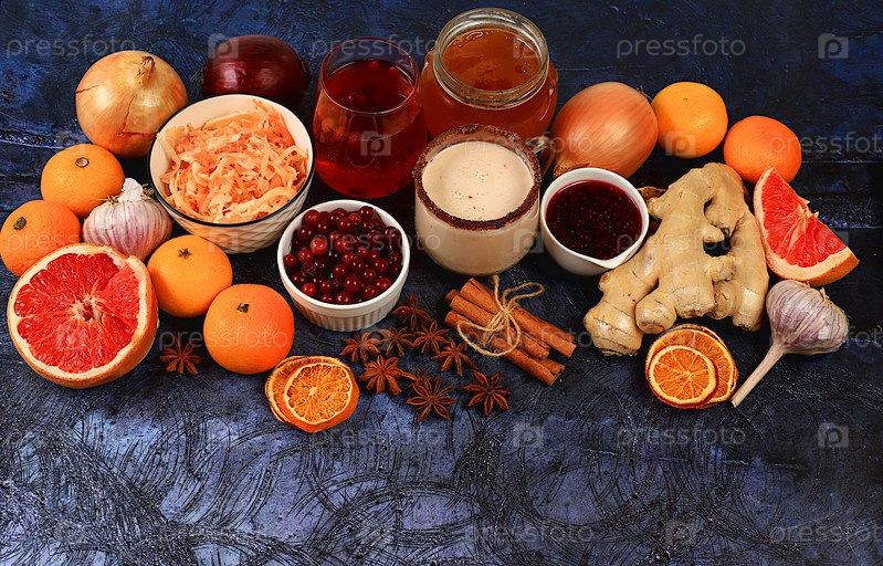 Полезные натуральные продукты с витамином С от гриппа и простуды. Выбирайте свежие фрукты и овощи и натуральные ингредиенты для укрепления иммунной системы. Органическая защита от вирусов,