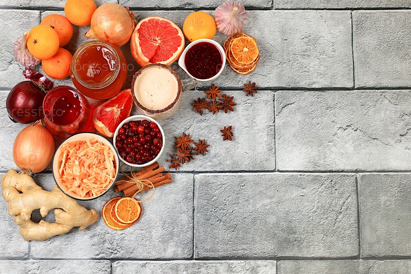 Полезные натуральные продукты с витамином С от гриппа и простуды. Выбирайте свежие фрукты и овощи и натуральные ингредиенты для укрепления иммунной системы. Органическая защита от вирусов,