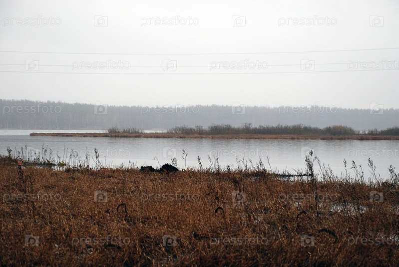 Осенний пейзаж на озере. Осенний день. Ровная водная поверхность без волн. По берегам озера растут кусты и деревья с желтой и коричневой листвой. Сверху серое облачное небо