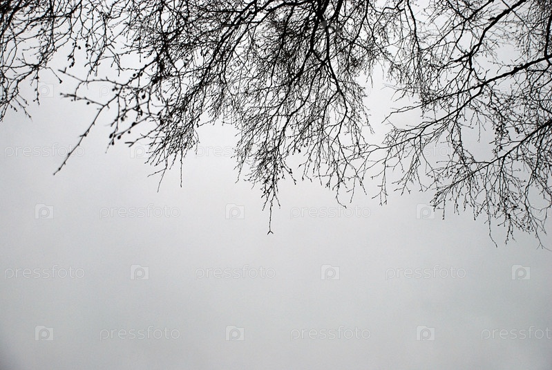Длинные ветки березы без листьев. Глядя вверх из-под больших длинных черных ветвей деревьев, растущих неподалеку. У них длинные тонкие изогнутые ветви на фоне пасмурного светло-белого неба