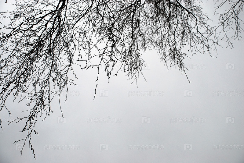 Длинные ветки березы без листьев. Глядя вверх из-под больших длинных черных ветвей деревьев, растущих неподалеку. У них длинные тонкие изогнутые ветви на фоне пасмурного светло-белого неба