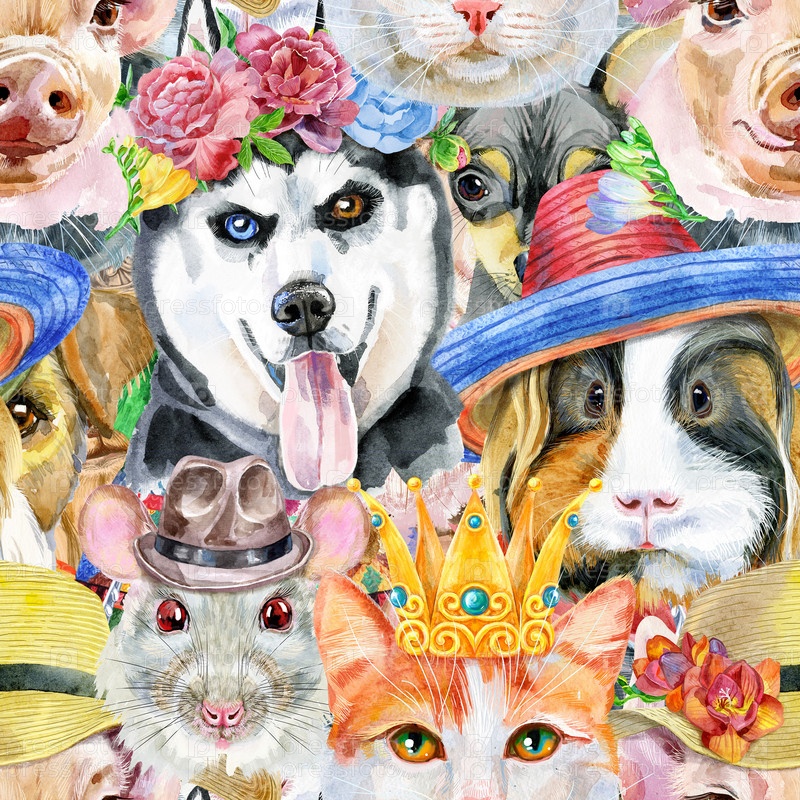 Бесшовный рисунок собаки, морской свинки, кошки, мини-свиньи и крысы. Иллюстрация акварельных домашних животных. Акварель рисованной иллюстрации