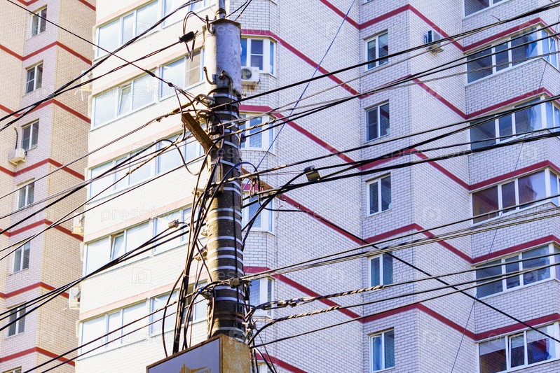 Столб с кабелями связи и проводами