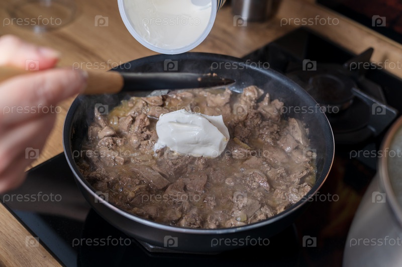 Рука добавляет сметану на сковороду с жареной печенью