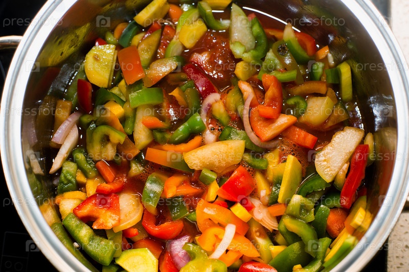 Цветные ломтики перца, сваренные в кастрюле