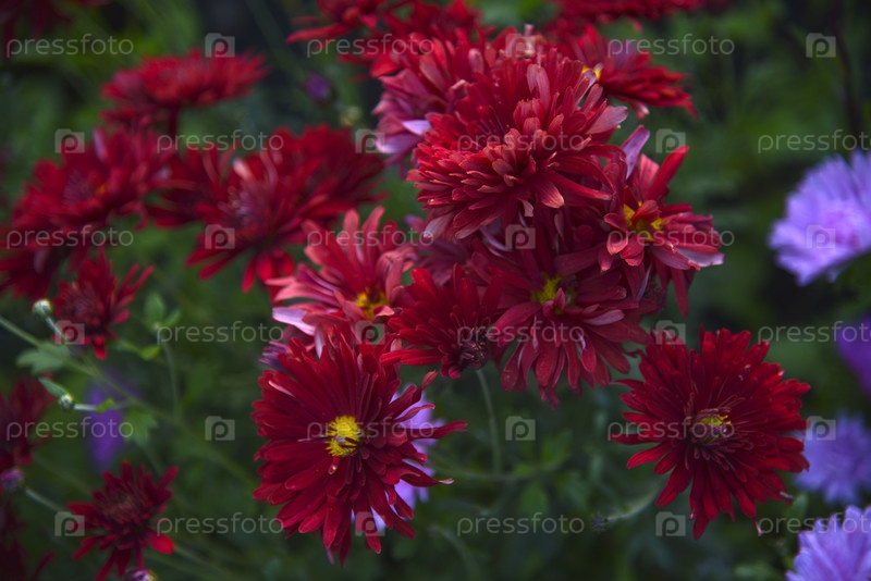 Букет красивых ярко-красных цветов хризантемы в зеленом саду. Большие красные цветы