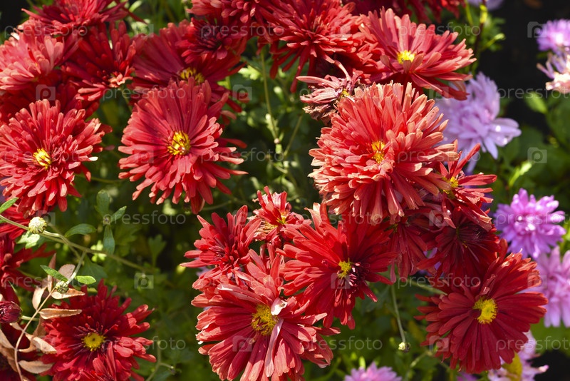Букет красивых ярко-красных цветов хризантемы в зеленом саду. Большие красные цветы