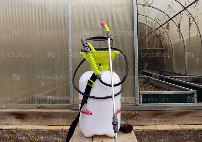 Помповый опрыскиватель на фоне открытой теплицы