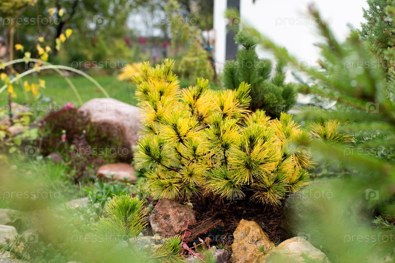 Желтая карликовая сосна в рокарии